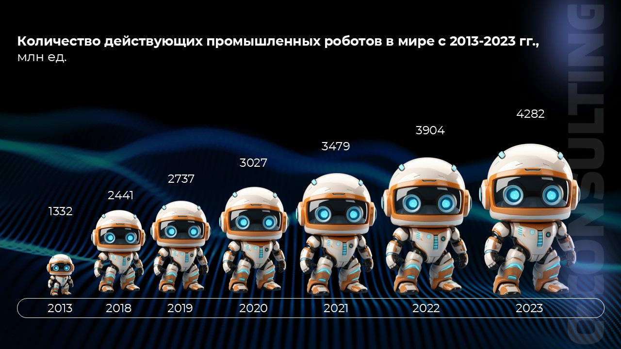 Промышленные роботы помогают автоматизировать различные технологические процессы. В 2023 г. на предприятиях по всему миру работало более 4 млн таких роботов, что на 10% больше по сравнению с предыдущим годом.