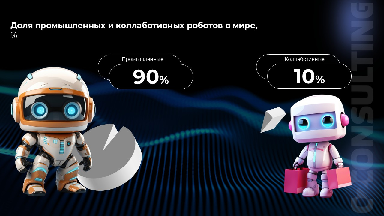 Особую роль играют коллаборативные роботы, или коботы. Они дешевле, компактнее и безопаснее, чем традиционные промышленные машины. Коботы могут работать рядом с людьми, что делает их особенно удобными в использовании. Однако в общем количестве промышленных роботов коботы составляют всего около 10%.