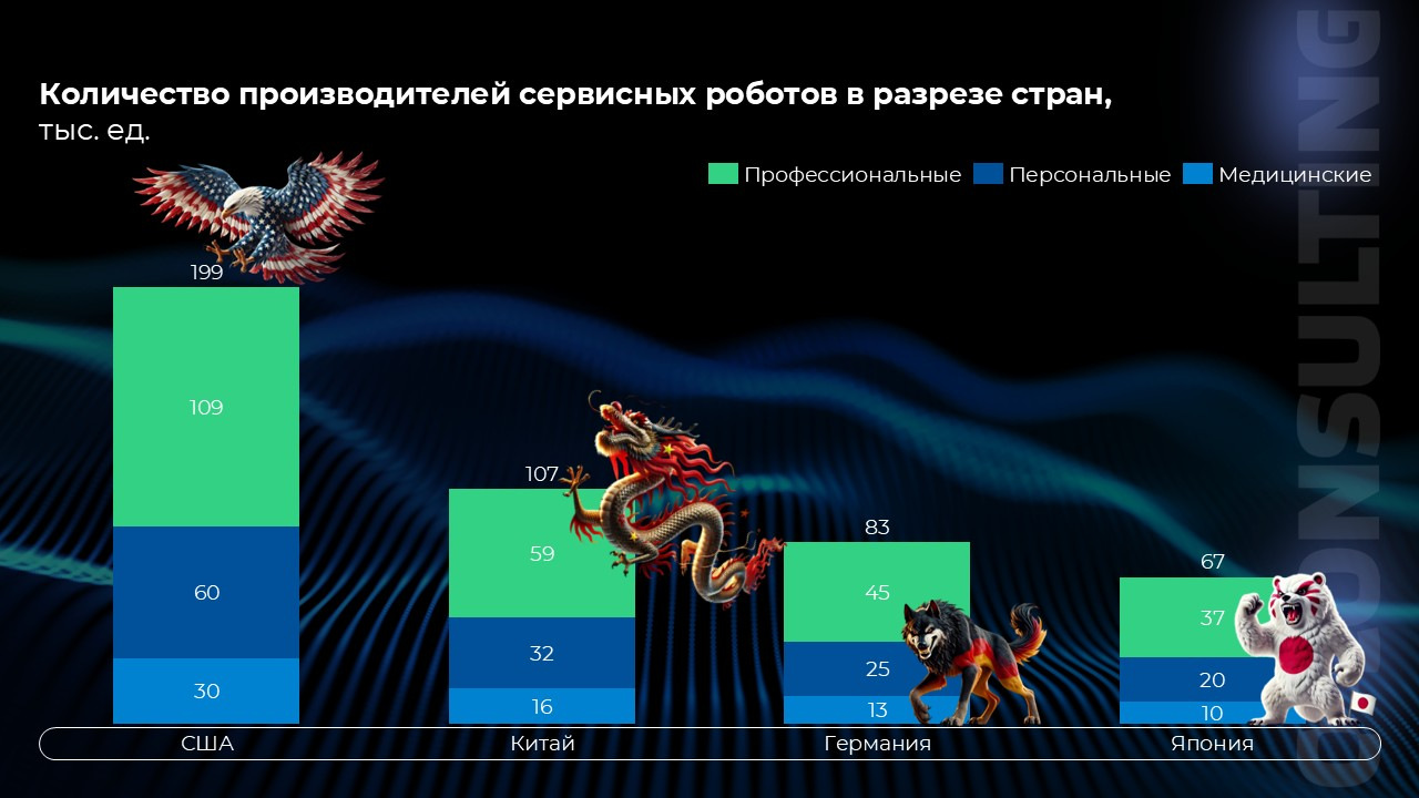 Пять основных рынков для промышленных роботов – Китай, Япония, США, Южная Корея и Германия. На эти страны приходится 79% всех установленных в мире роботов, что составляет чуть больше 400 тысяч единиц. Китай по-прежнему является лидером на глобальном рынке, в 2023 г. там было установлено 276 тысяч промышленных роботов, что составляет более половины от общего числа.