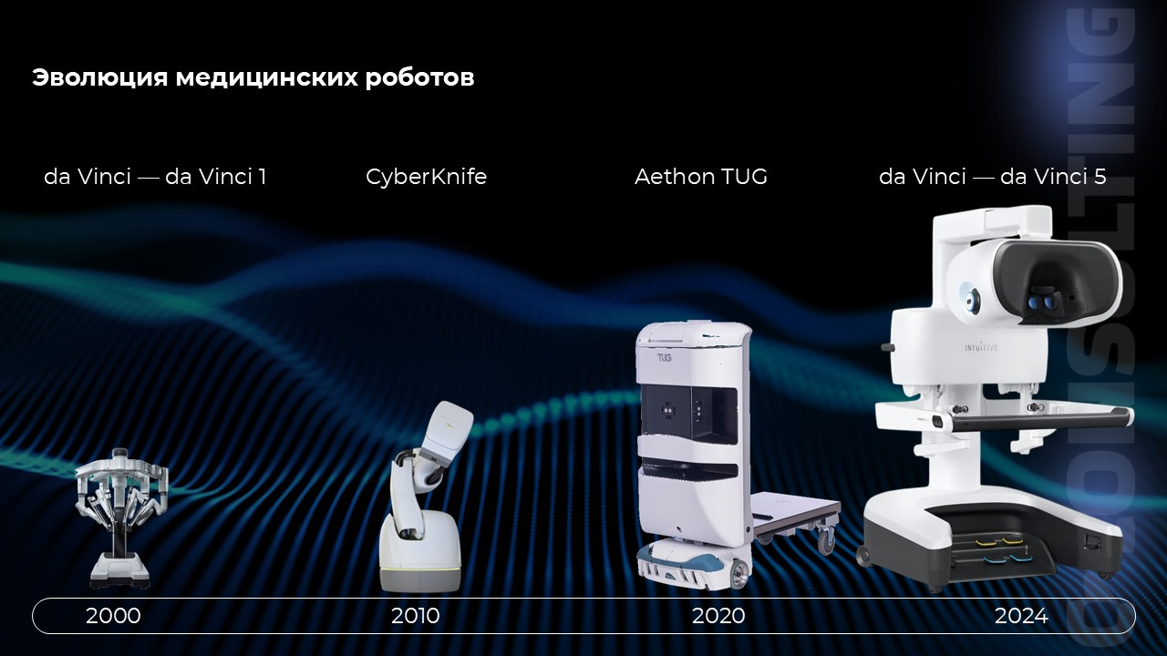 В 2000 г. медицинская робототехника только начинала набирать популярность. В то время существовала всего одна значимая система – da Vinci Surgical System, разработанная компанией Intuitive Surgical. Эта система произвела революцию в хирургии, позволяя проводить минимально инвазивные операции с высокой точностью. Система da Vinci давала хирургам возможность управлять роботизированными манипуляторами через консоль, что обеспечивало более точное выполнение операций. Однако у этой системы были ограничения, и она требовала значительной подготовки и опыта от хирургов.