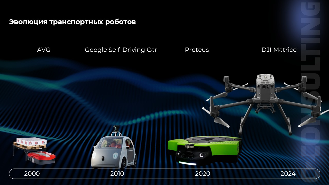 В 2000 г. рынок логистических роботов только начинал развиваться. На тот момент основными представителями были AGV (Automated Guided Vehicles) – автоматизированные транспортные средства, использующие рельсы или магнитные метки для навигации. Эти устройства применялись на складах и в производственных помещениях для перемещения материалов и товаров. Однако их функциональность была ограничена, так как они могли двигаться только по заранее заданным маршрутам и не были предназначены для работы рядом с людьми.