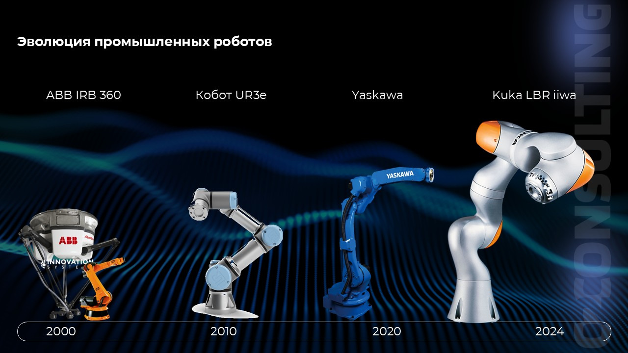 В начале 2000-х гг. промышленная робототехника находилась на этапе активного развития. В это время количество промышленных роботов по всему миру составляло около 1,1 млн единиц. Эти роботы в основном использовались для выполнения рутинных задач, таких как сварка, покраска и сборка на конвейерах. Примеры таких роботов включают KUKA и ABB, которые предлагали манипуляторы с ограниченной функциональностью и требовали сложного программирования.