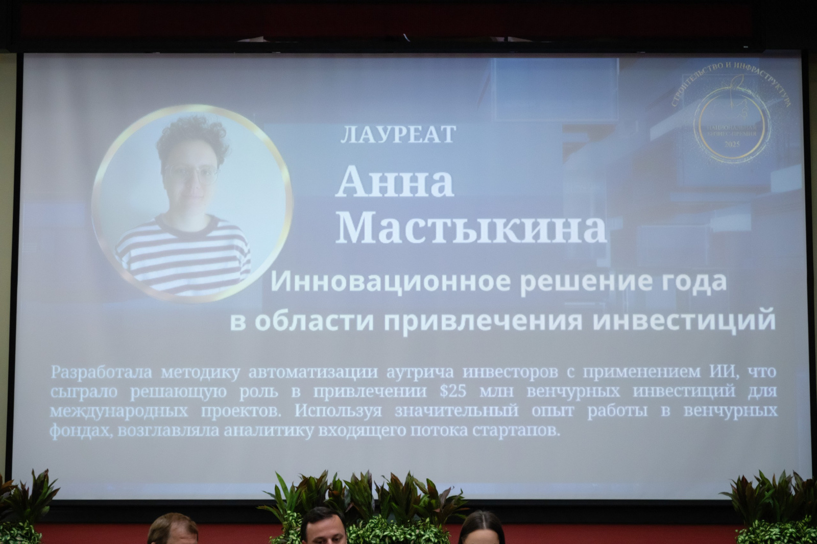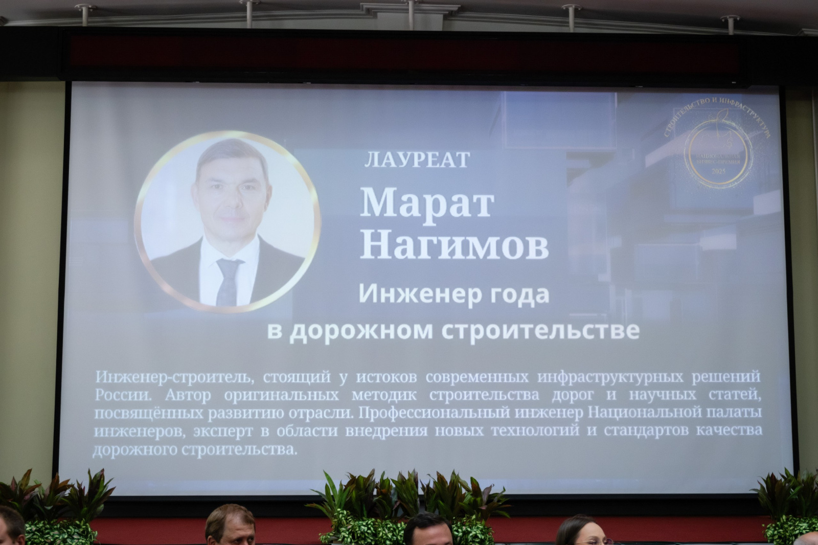В результате лауреатами Национальной бизнес-премии «Строительство, Инфраструктура и Финансы 2025» стали: в номинации «инженер года в дорожном строительстве» – заместитель директора Группы Компаний АО «СМП-Нефтегаз» и АО «Автострада» Марат Нагимов, он отмечен за выдающийся вклад в развитие дорожной инфраструктуры страны; в номинации «инновационное решение года в области привлечения инвестиций» – CEO&Founder агентства Taskinfinity.com Анна Мастыкина за разработку методики привлечения инвестиций с использованием ИИ; в номинации «инженер года в нефтяной и газовой промышленности» – Александр Довбик, старший технолог, АО «СибурТюменьГаз» за значительный вклад в повышение операционной эффективности, надежности и экологической безопасности производства. «Бизнес-инноватором года» был назван Элмурат Эркин уулу, предприниматель и инноватор в строительной отрасли Кыргызстана за внедрение инновационных антибактериальных напольных покрытий при строительстве социальных объектов; «инженером года в области промышленных зданий и сооружений» экспертный совет признал Тимура Вейса, инженера технического контроля, отметив его передовые решения при реставрации объекта историко-культурного наследия в г. Сочи. Советник генерального директора строительной компании «СТ ТРЕЙД» Хакимджон Икромов получил диплом лауреата Премии как лучший «руководитель года в сфере строительства» за внедрение инновационных методов управления в работу компании. Артем Захаров, арбитражный управляющий, стал «риск-менеджером года» за успешную реализацию масштабного антикризисного проекта; «инвестором года» признан Валерий Золотухин, основатель инвесткомпании «Импакт Капитал» и автор инновационной многокомпонентной системы оценки инвестиционных объектов. Главный архитектор и основатель студии «Васту Дизайн» Ольга Ильина стала лучшей в номинации «архитектор года в сфере проектирования жилых домов» за популяризацию методов построения гармоничных пространств; заместитель директора департамента по транзакционному бизнесу ПАО АКБ «Металлинвестбанк» Дмитрий Старцев – в номинации «директор года в области продаж» за внедрение инновационных методов геймификации и персонализации мотивации сотрудников; «предпринимателем года в сфере строительства» стал бизнесмен, основатель собственной компании Юсуф Яров за инновации при строительстве крупного строительного проекта Южного университет Азии.