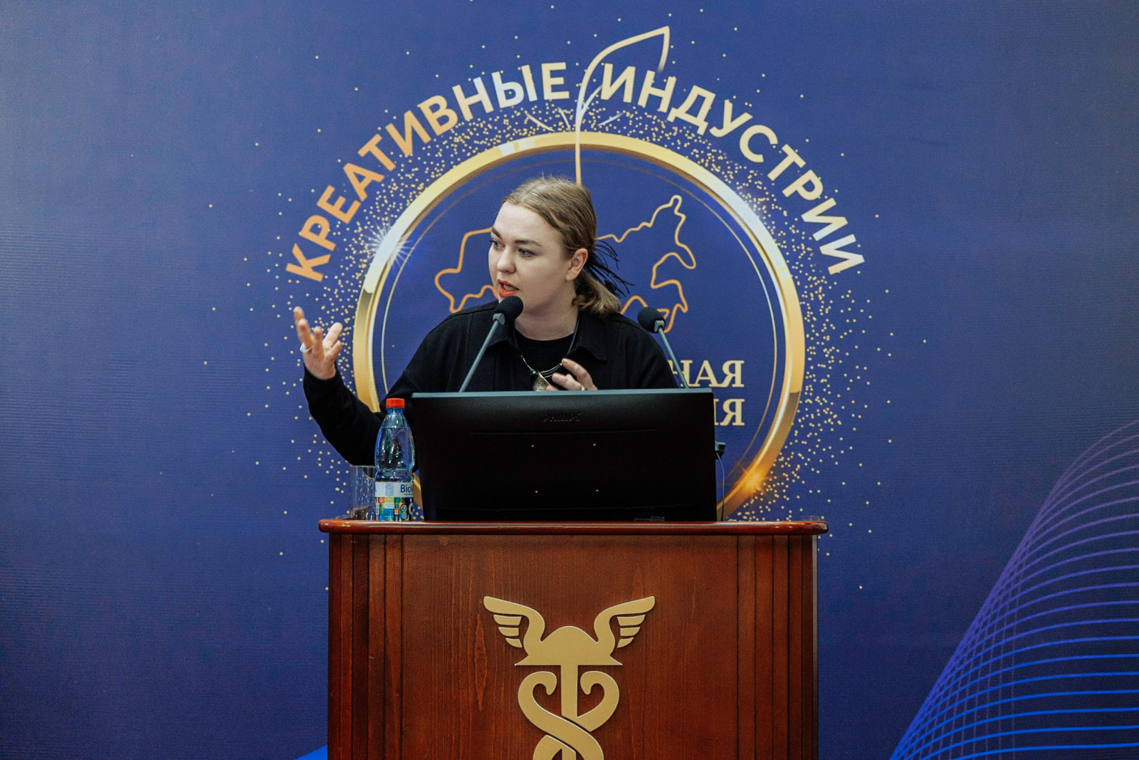 Прикладные кейсы по развитию потенциала российской креативной экономики были представлены в Треке 6. Наибольший резонанс вызвал доклад о технологиях на стыке дизайна, архитектуры и высоких технологий, используемых для создания высокотехнологичных музеев, выставочных павильонов, интерактивного пространства и профориентационных площадок рассказала Регина Поршнева, директор проектного офиса многоформатной компании «ВИЖУ» (ООО «ВИМ Тех»):
