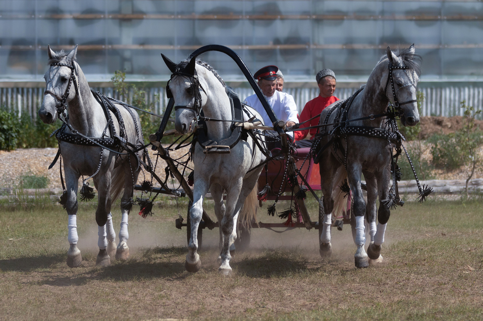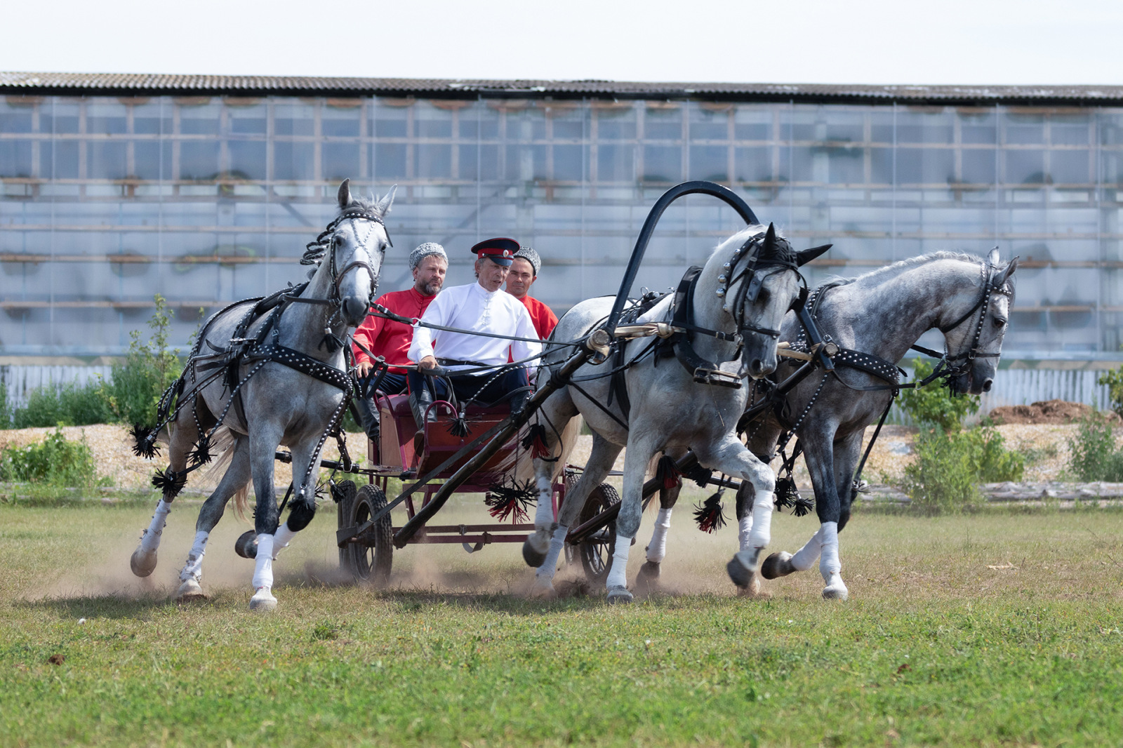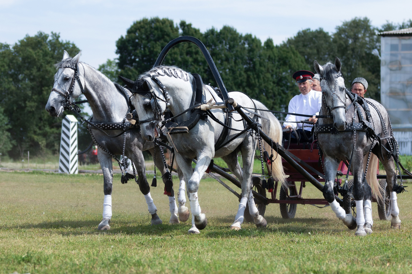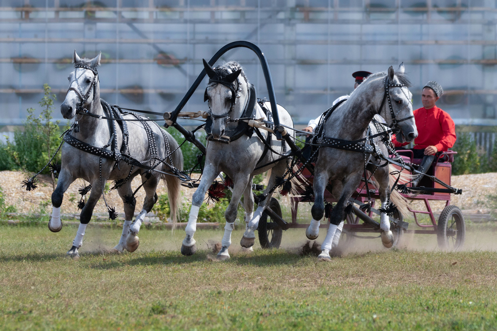 Леонид Смаглия. Особый восторг вызвал выезд роскошной серой тройки орловских рысаков Первого Московского Конного завода под управлением мастера Леонида Смаглия (ПАО «Акрон»). Их показательная программа стала гимном красоте и мощи орловской породы.