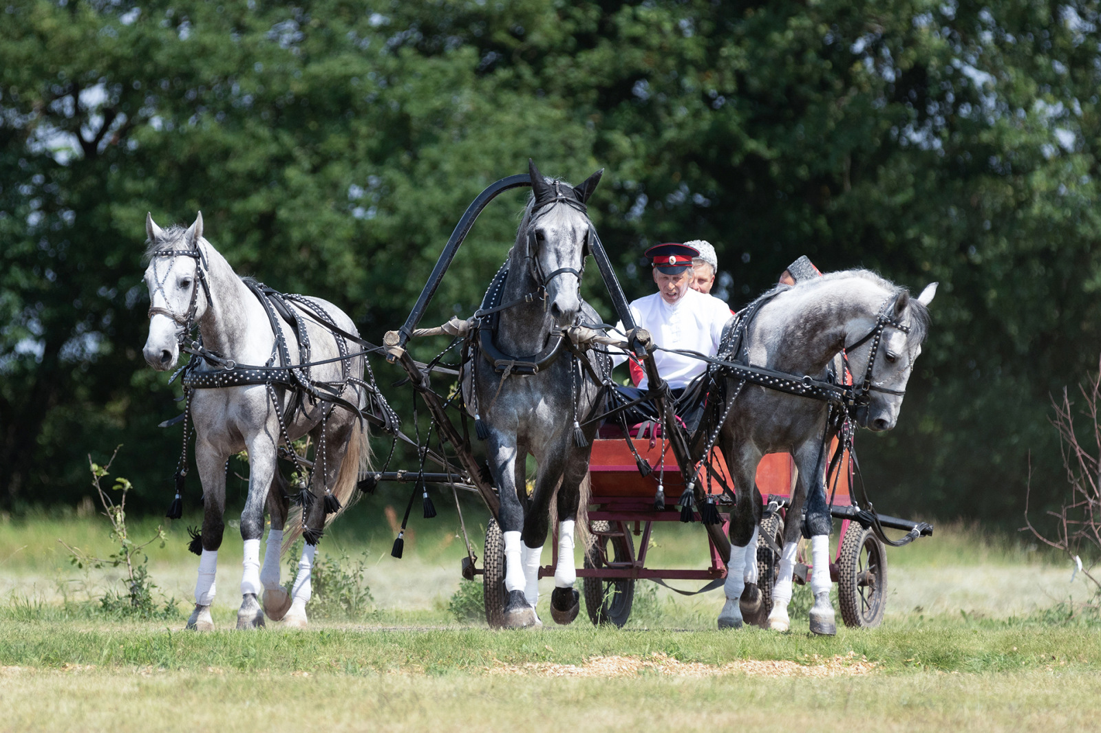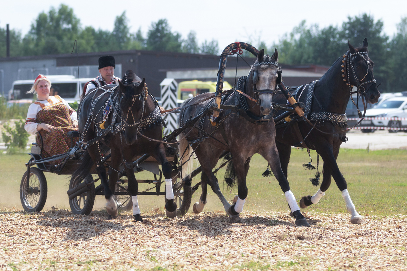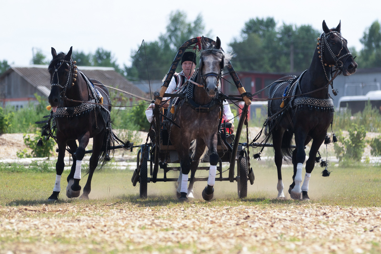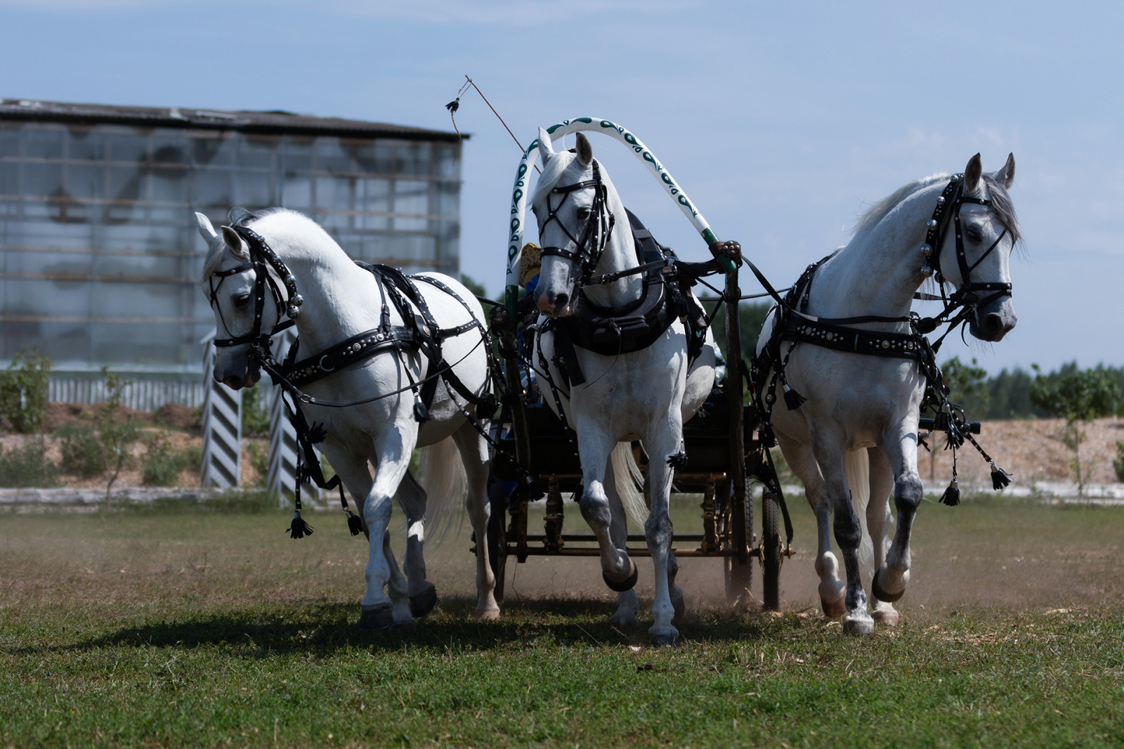 Леонид Смаглия. Особый восторг вызвал выезд роскошной серой тройки орловских рысаков Первого Московского Конного завода под управлением мастера Леонида Смаглия (ПАО «Акрон»). Их показательная программа стала гимном красоте и мощи орловской породы.