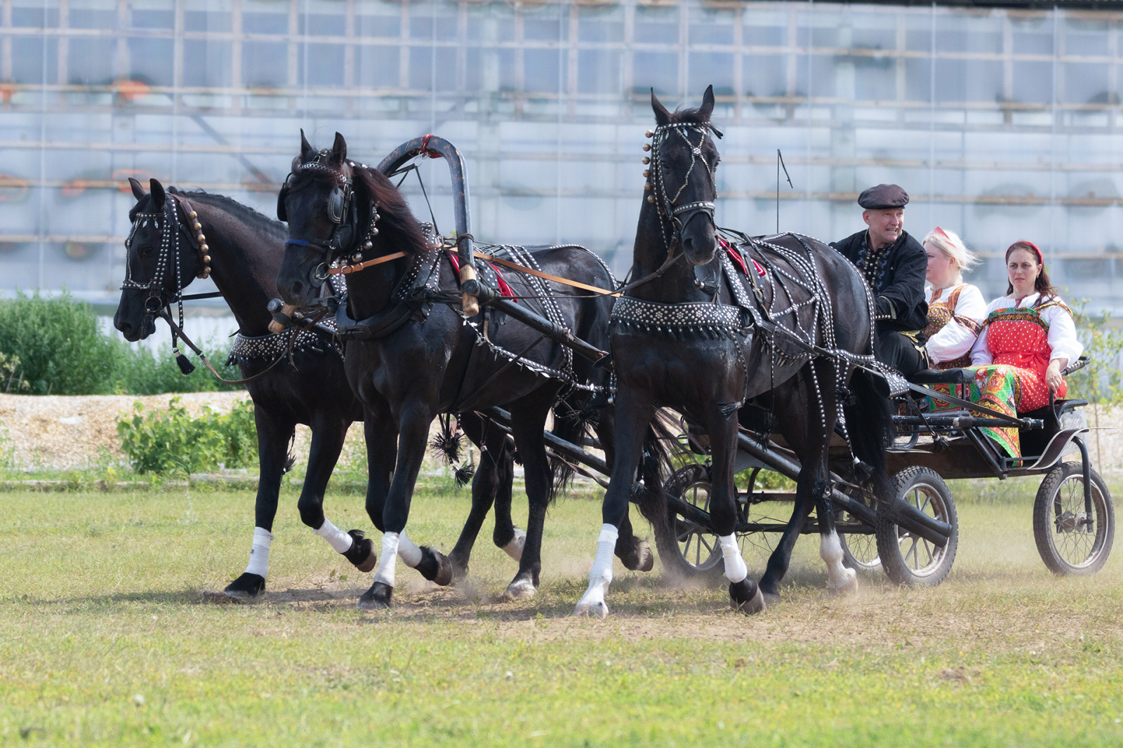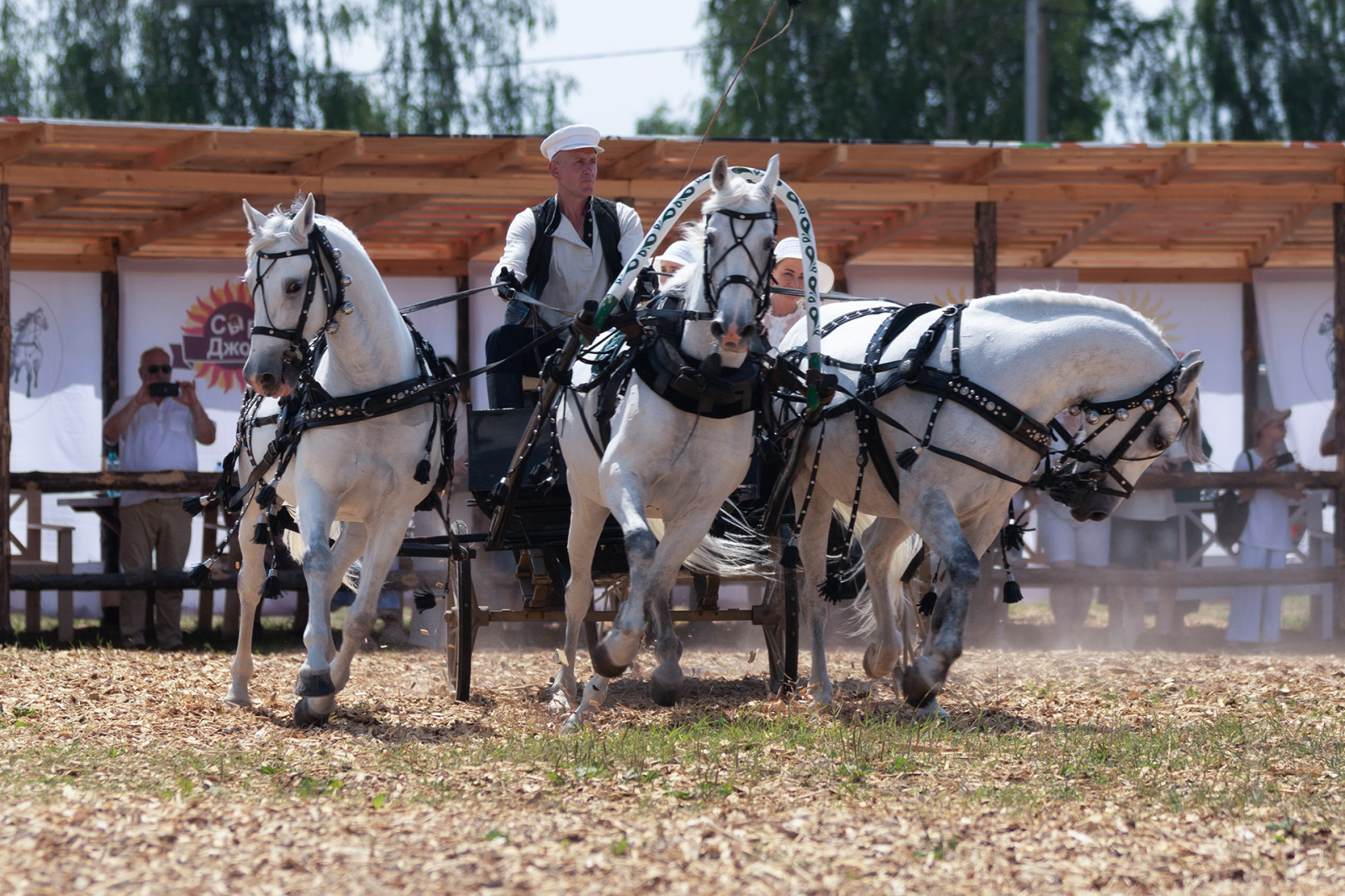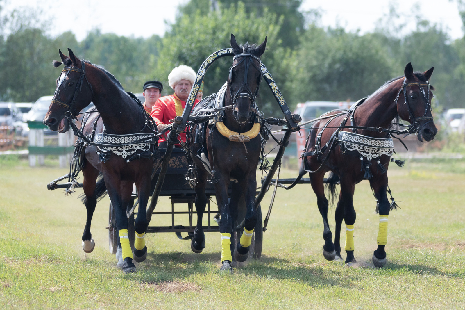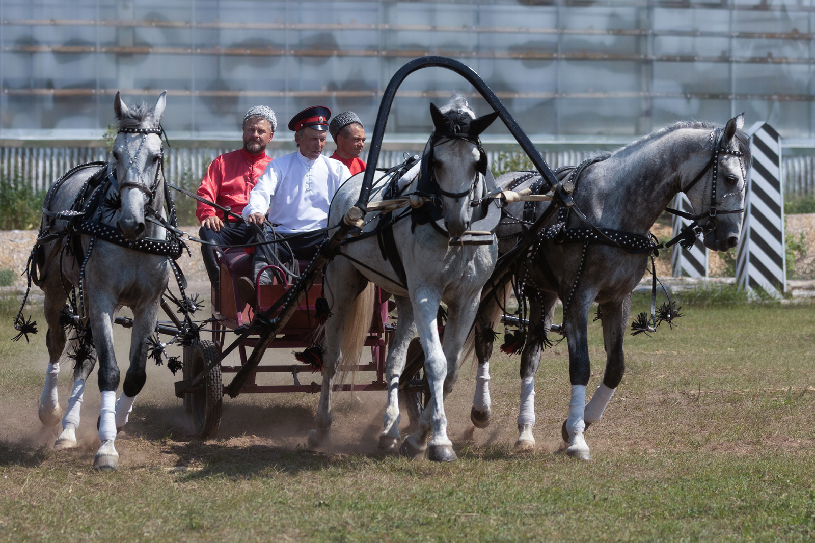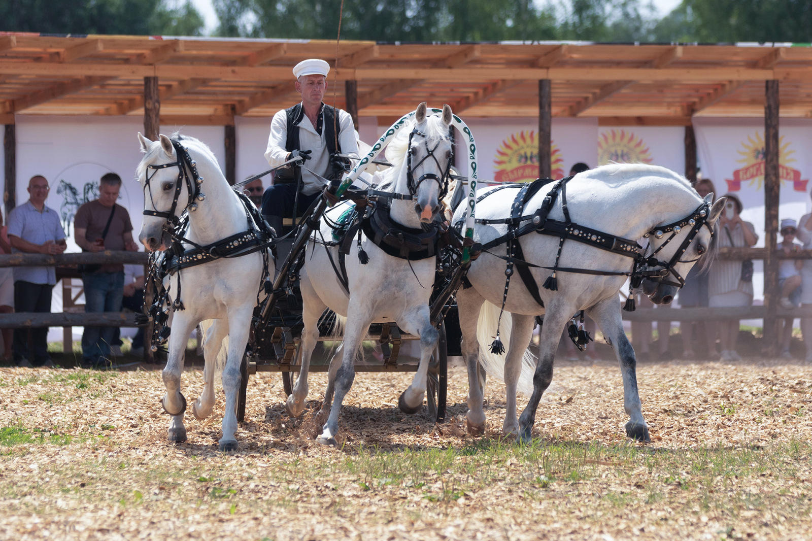 Леонид Смаглия. Особый восторг вызвал выезд роскошной серой тройки орловских рысаков Первого Московского Конного завода под управлением мастера Леонида Смаглия (ПАО «Акрон»). Их показательная программа стала гимном красоте и мощи орловской породы.