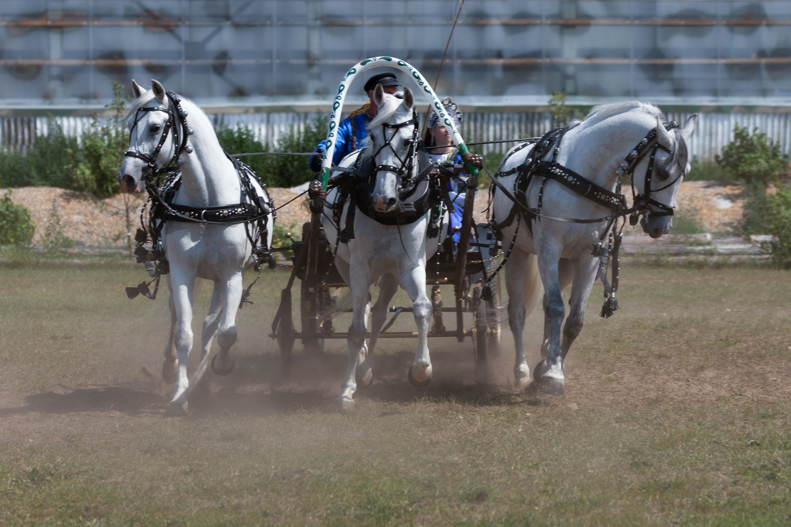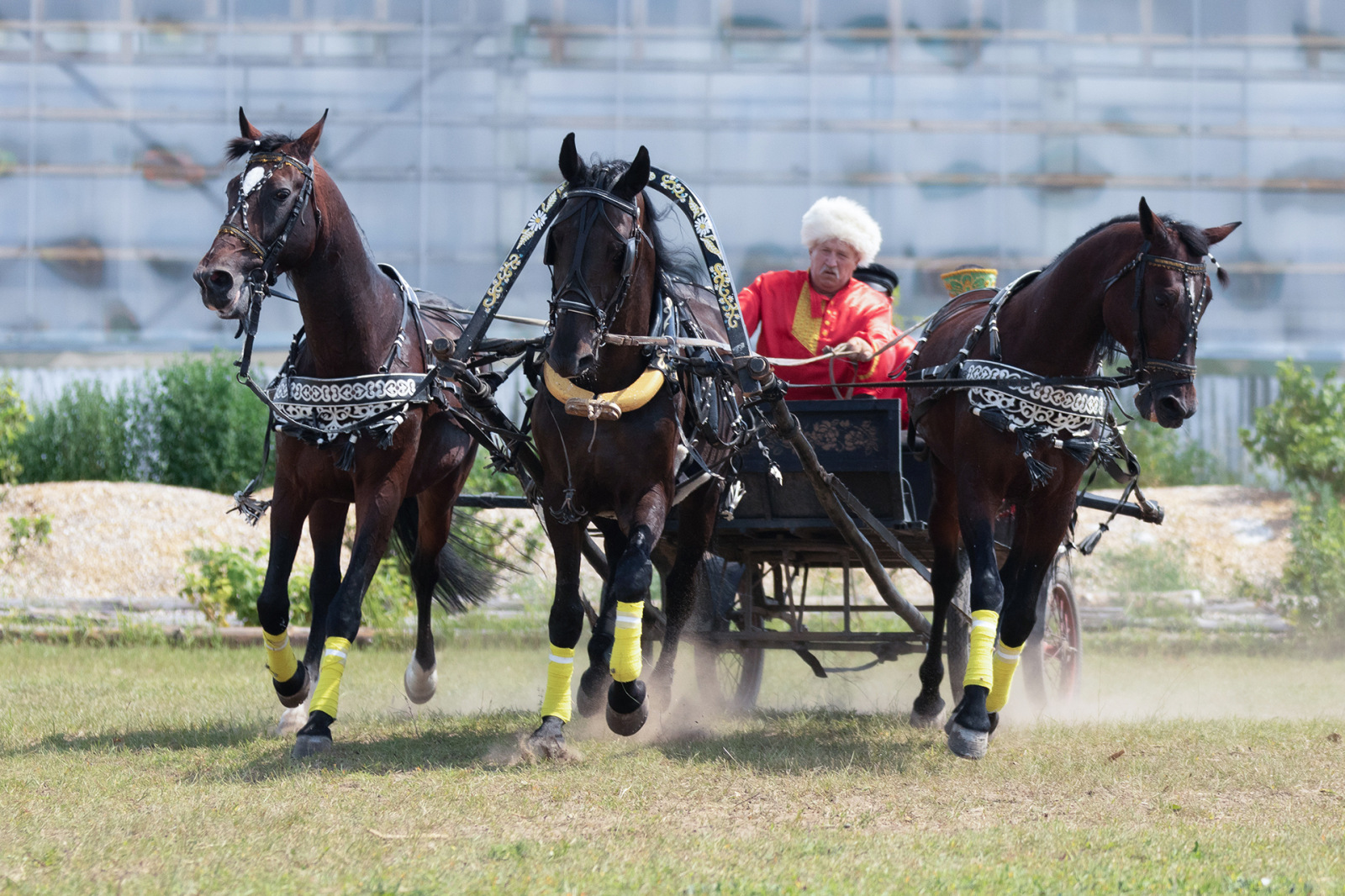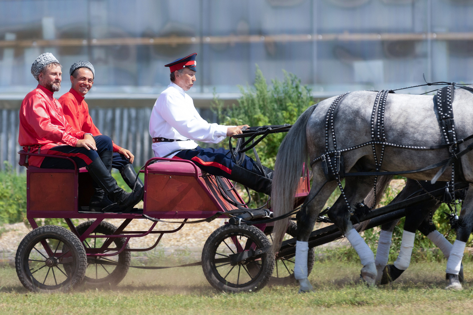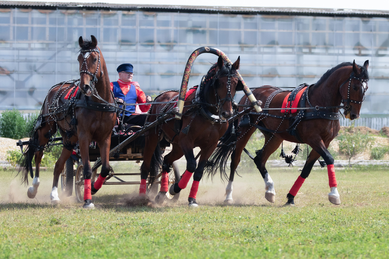 Леонид Смаглия. Особый восторг вызвал выезд роскошной серой тройки орловских рысаков Первого Московского Конного завода под управлением мастера Леонида Смаглия (ПАО «Акрон»). Их показательная программа стала гимном красоте и мощи орловской породы.