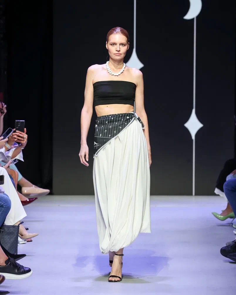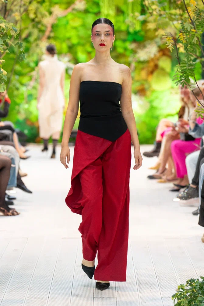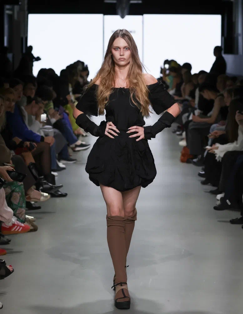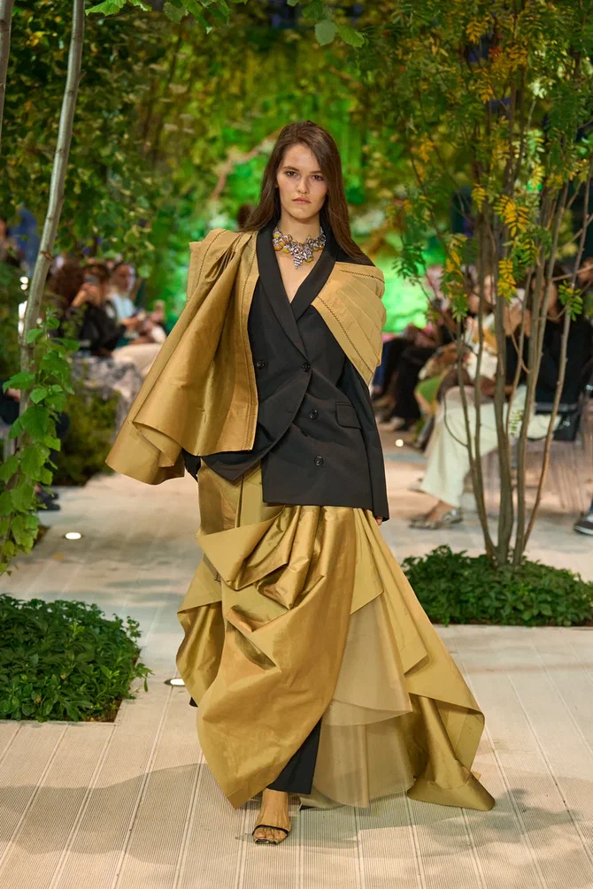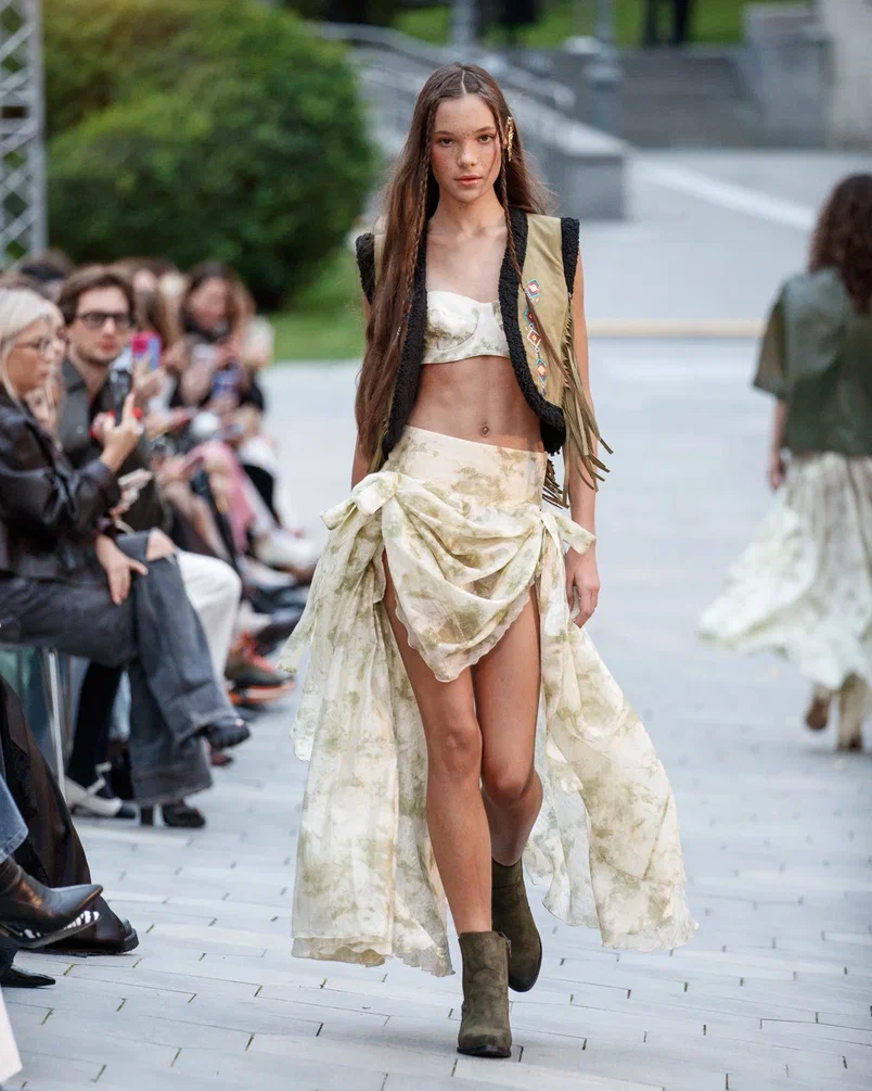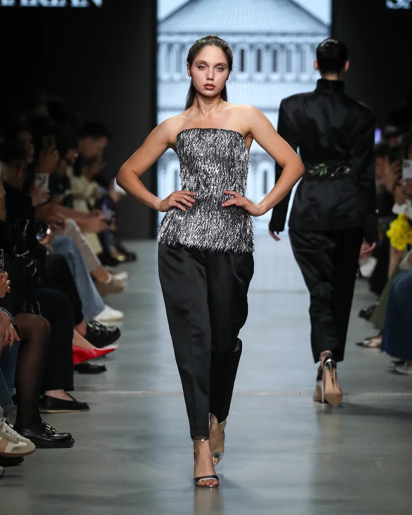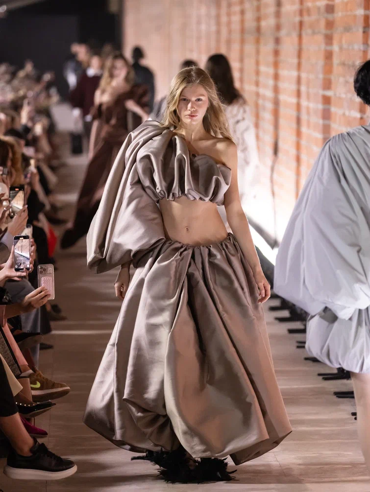 Для Модного дома Alena Akhmadullina этот показ стал по-настоящему символичным: в 2025 году бренд отмечает свое 25-летие. В честь юбилея Алена Ахмадуллина представила масштабное шоу, объединившее несколько направлений. На подиуме появились образы, вдохновленные мотивами средневекового русского искусства, архивные модели и даже индивидуальные работы дизайнера. Особую атмосферу вечеру придали друзья бренда: в дефиле участвовали Елена Летучая, Анна Александрова, Виктория Шелягова, а финал показа украсила Светлана Бондарчук.