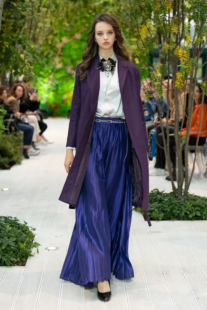 Коллекция получила название «Гармония противоположностей». Дизайнер проводит грань между традициями и современностью: классические силуэты костюмов, воздушные шелковые блузы и твидовые жакеты гармонично сочетаются с изделиями в стиле casual. Те же цепи, расслабленные клетчатые рубашки, худи, вельветовые бомберы дополнили строгую коллекцию. Особое внимание уделено цветовой палитре: акцентным стал насыщенный винный оттенок, который контрастирует на фоне спокойных гамм.
