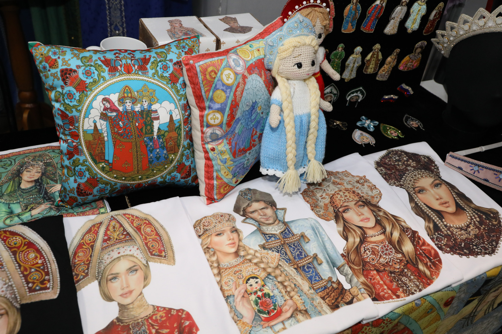 «Дом вышивки династии Вороновых» также поражал оригинальной техникой, сочетающей иглопись, текстильную имитацию фарфора, скульптурно-живописный декор, созданной когда-то основательницей династии Надеждой Вороновой. Особый запатентованный вид ткани создала дизайнер Ирина Егазарова (бренд Yaga) – из него получаются яркие, жизнеутверждающие, позитивные шали, платья, жакеты. На выставке можно было встретить и платье из виниловых пластинок, и свечи, обыгрывающие популярные современные мемы, и платья по мотивам русских сказок, созданные в процессе коллаборации дизайнера и писательницы. Встречала же гостей выставки «РусАртСтиль» запоминающаяся панорамная экспозиция Марии Барковской – самобытной художницы, мастера русского поп-арта.